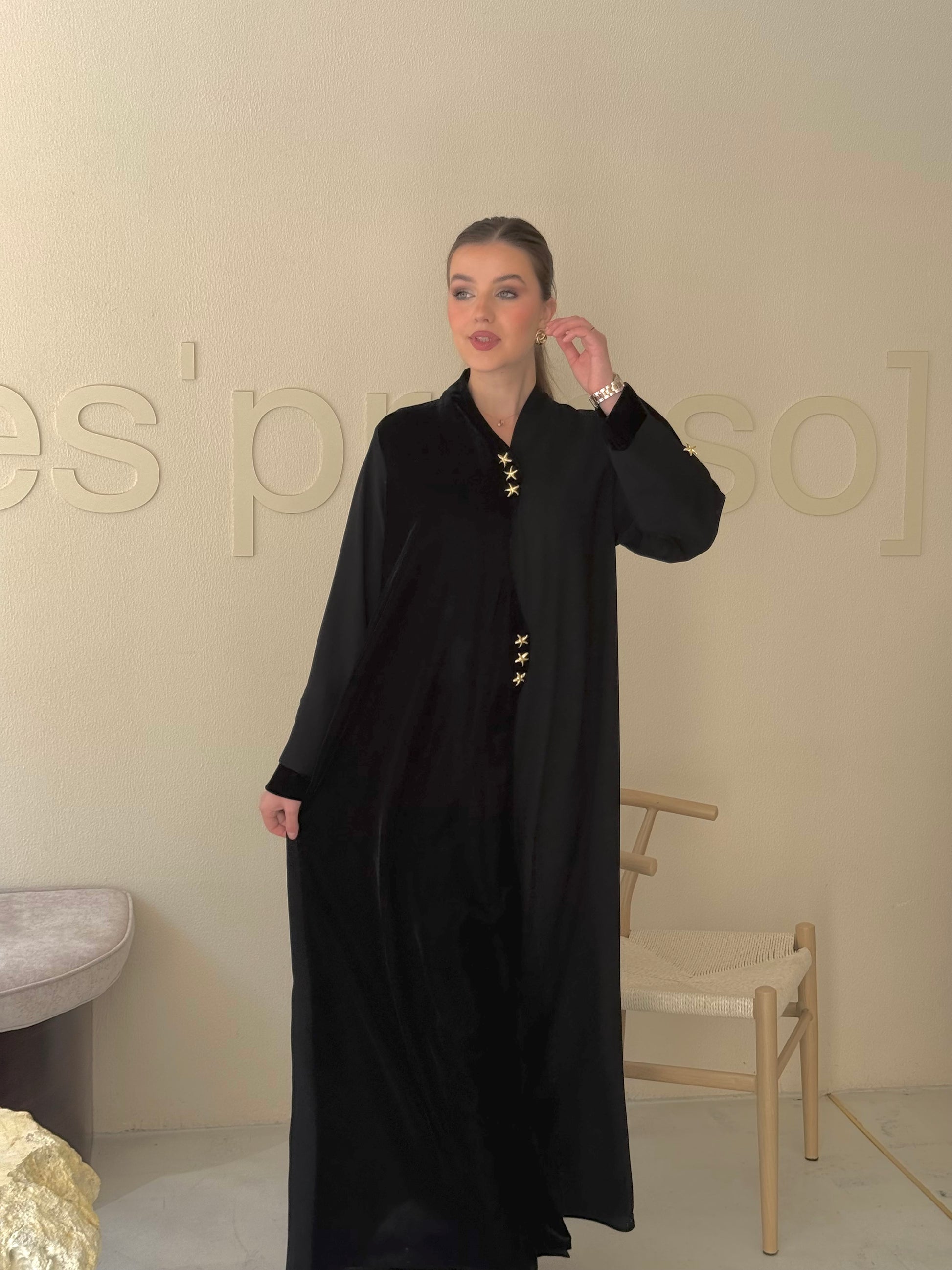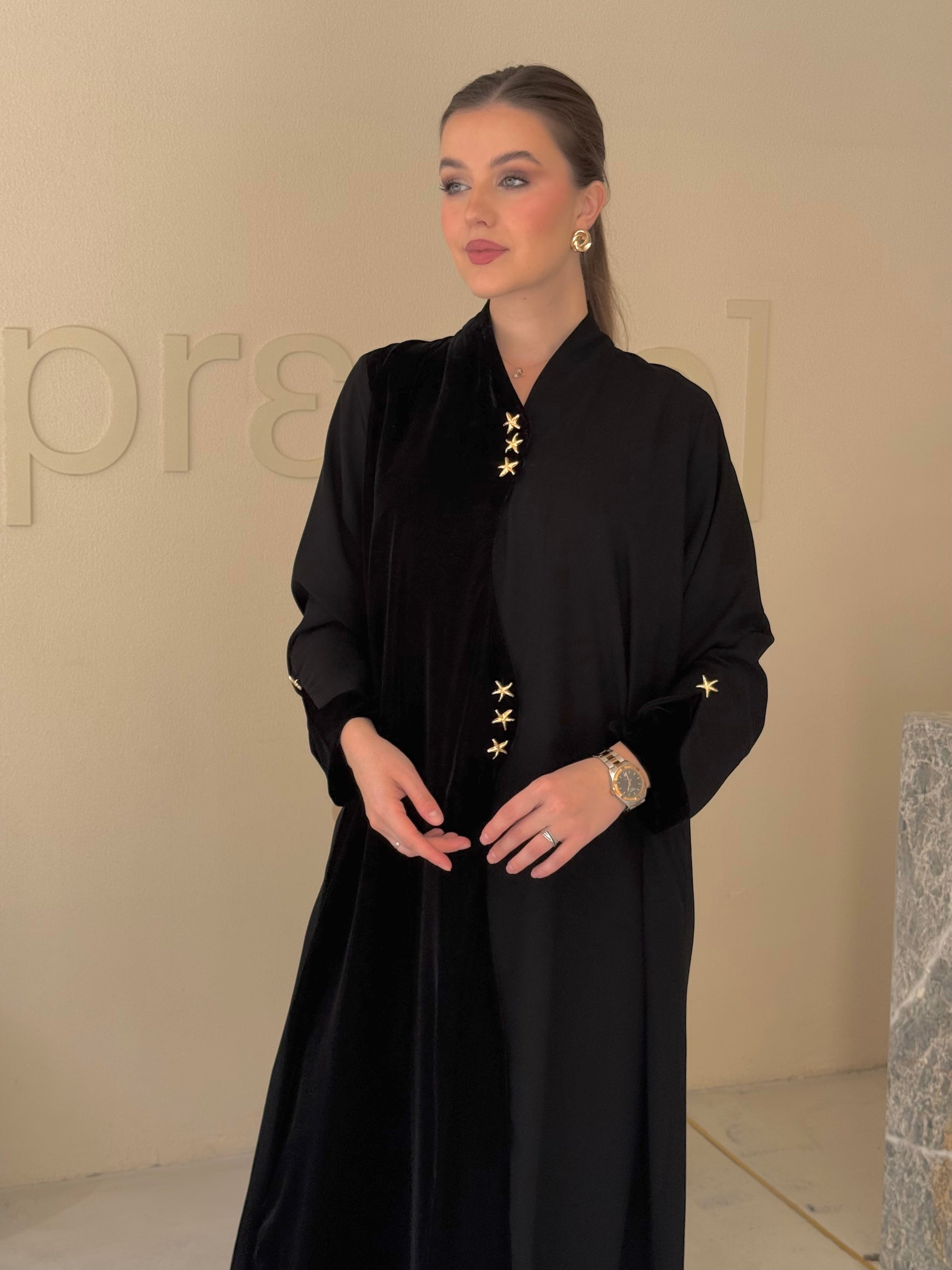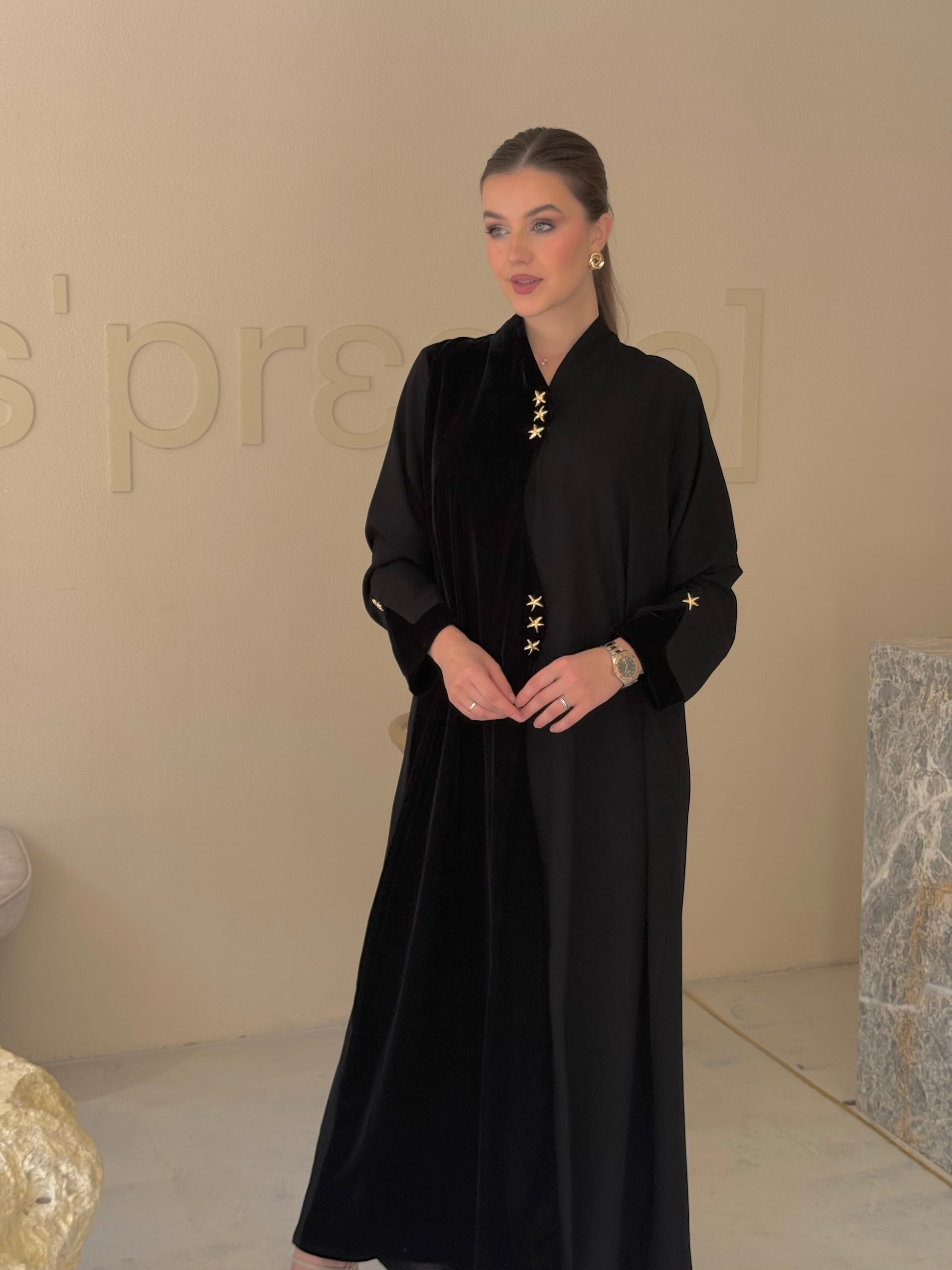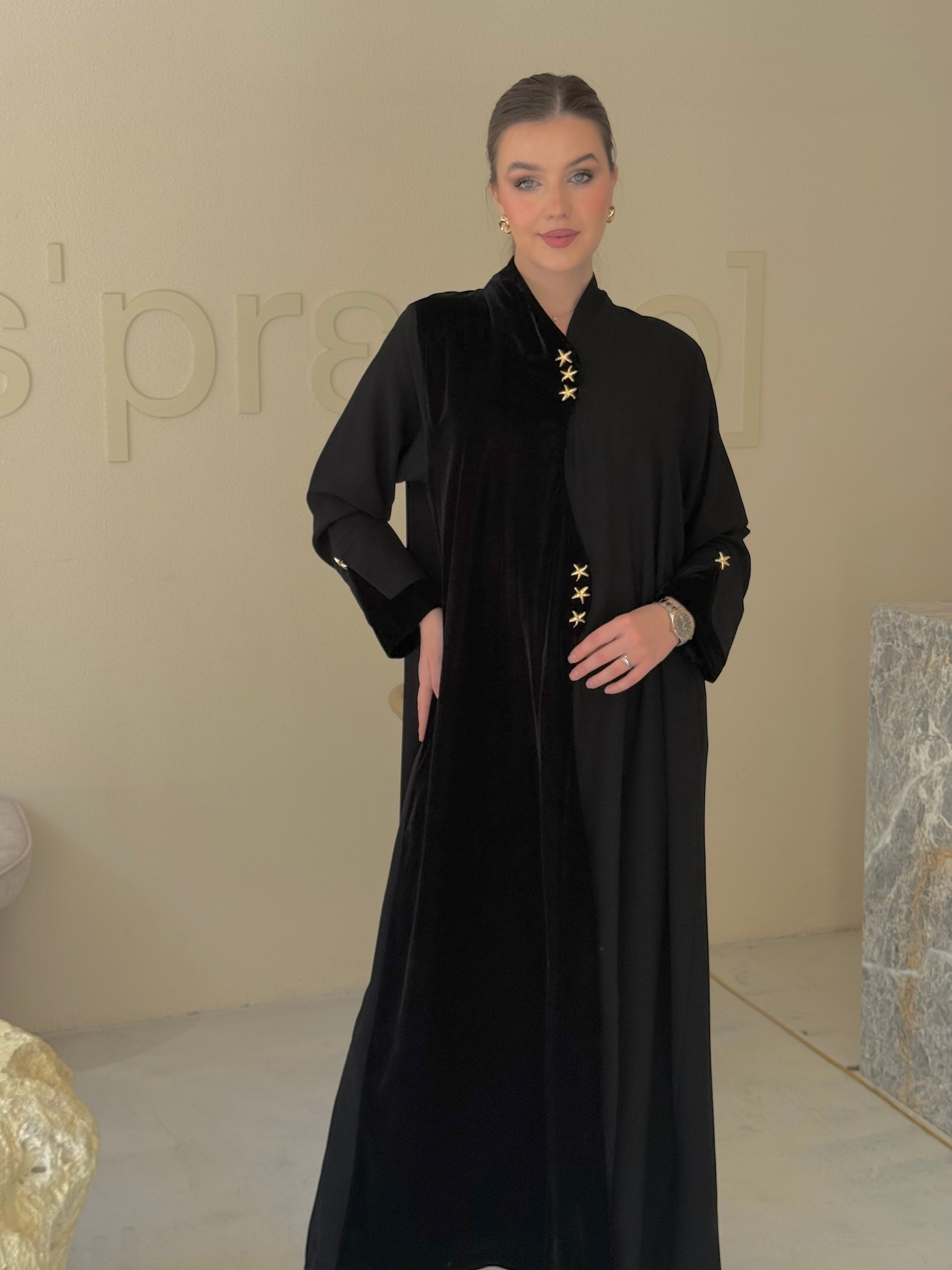 An elegant abaya featuring a refined mix of round shaped velvet and crepe fabrics, adorned with star-shaped buttons on front and sleeves