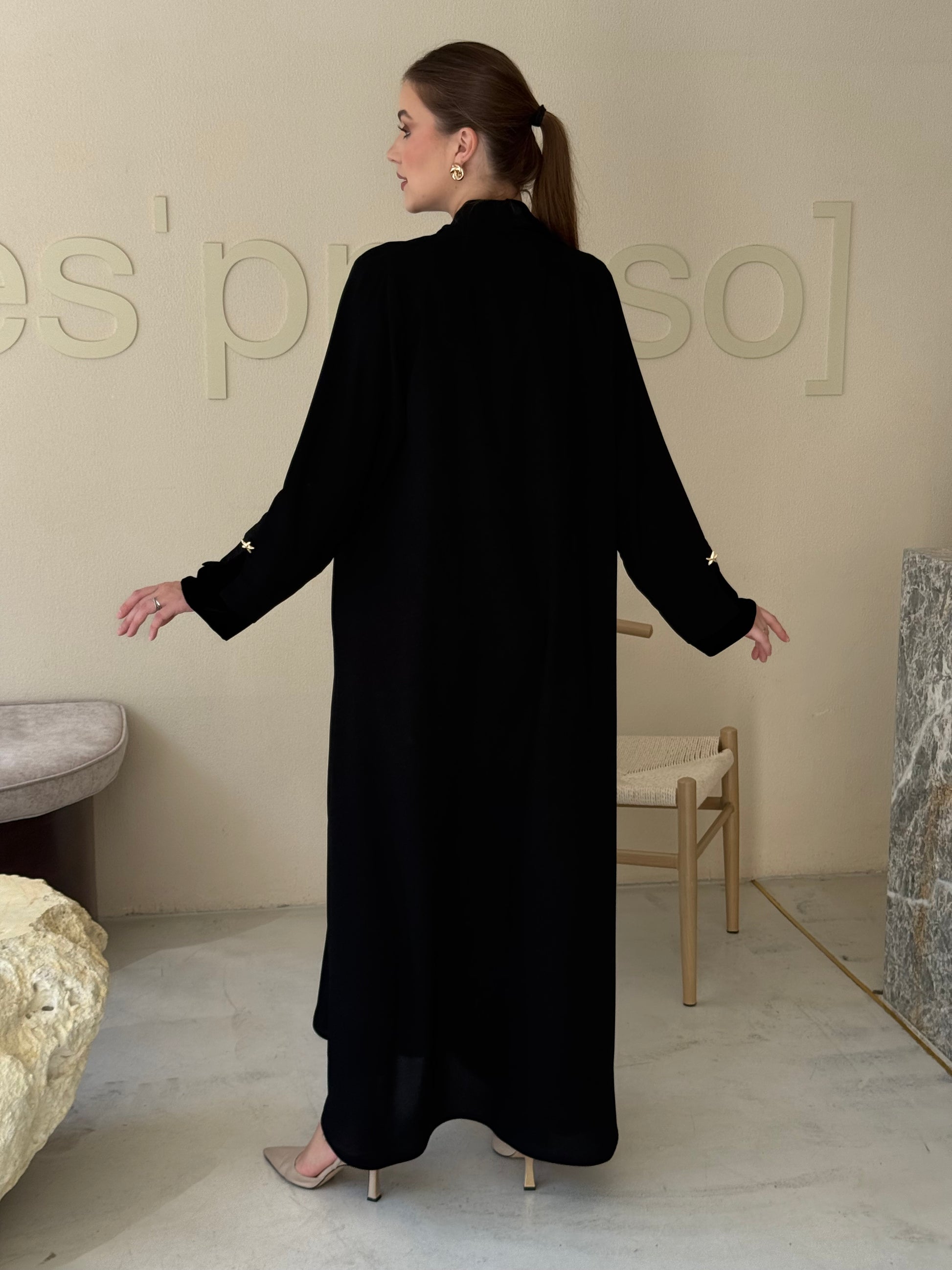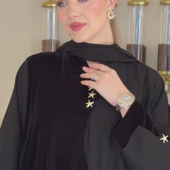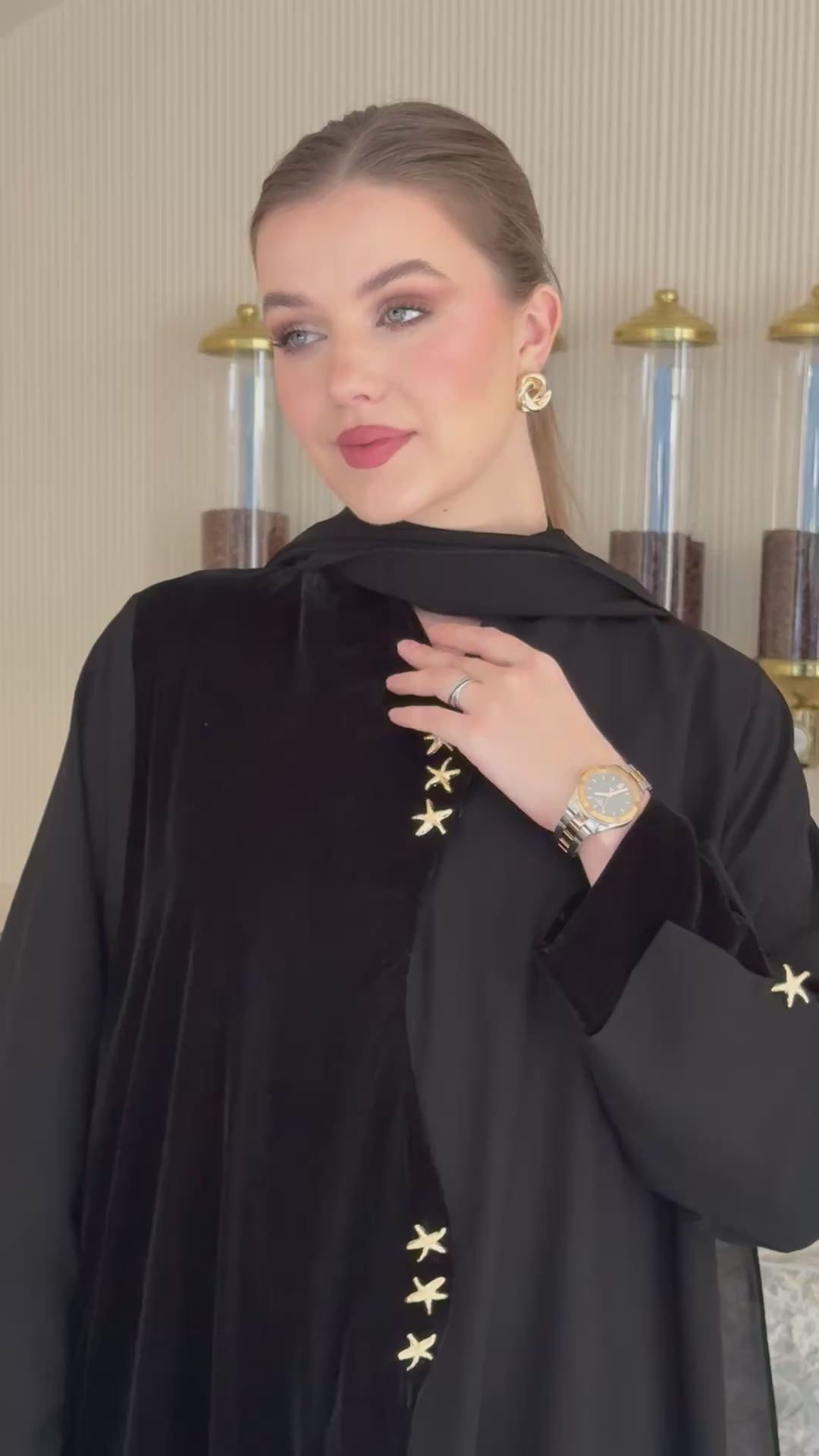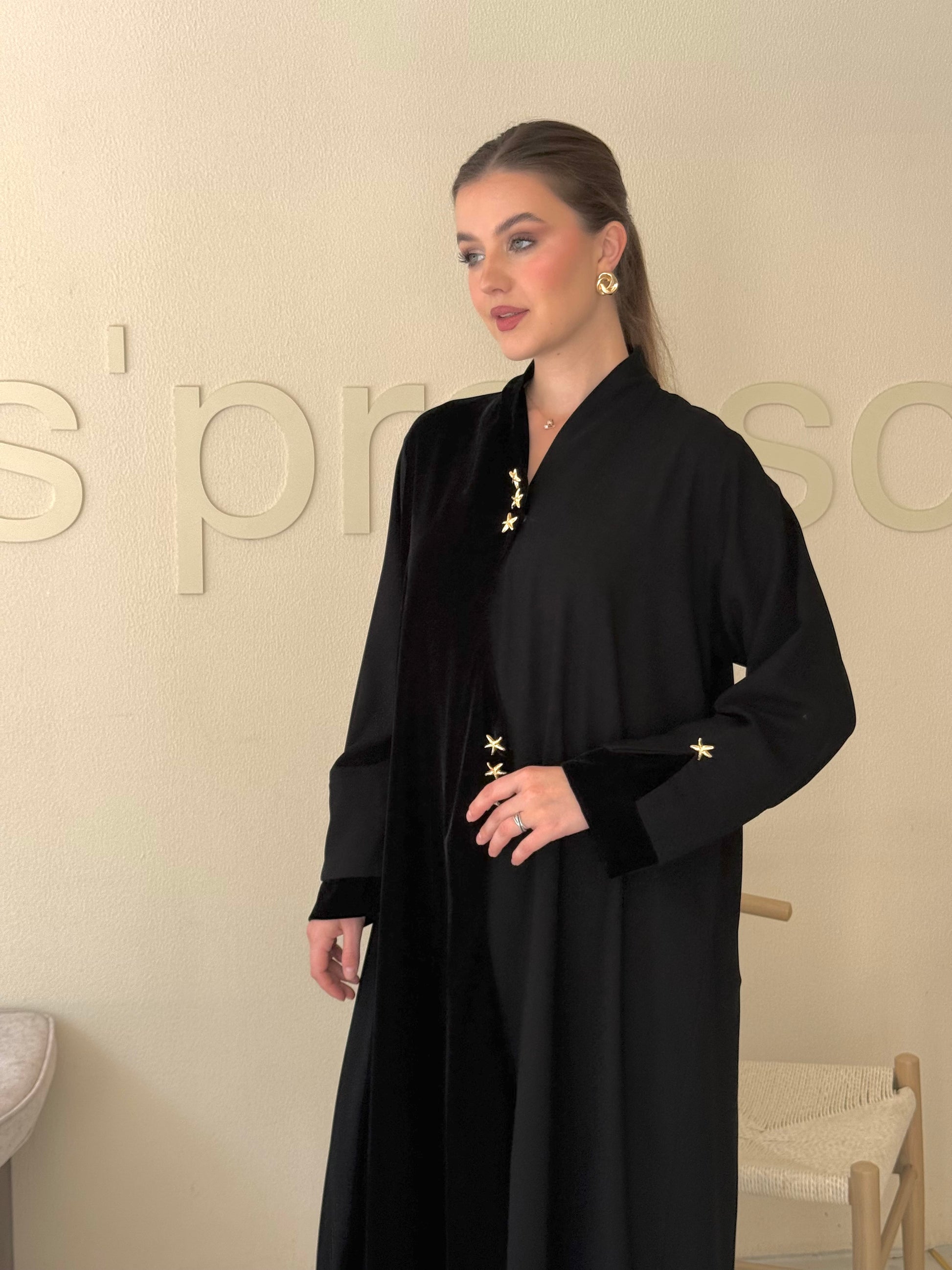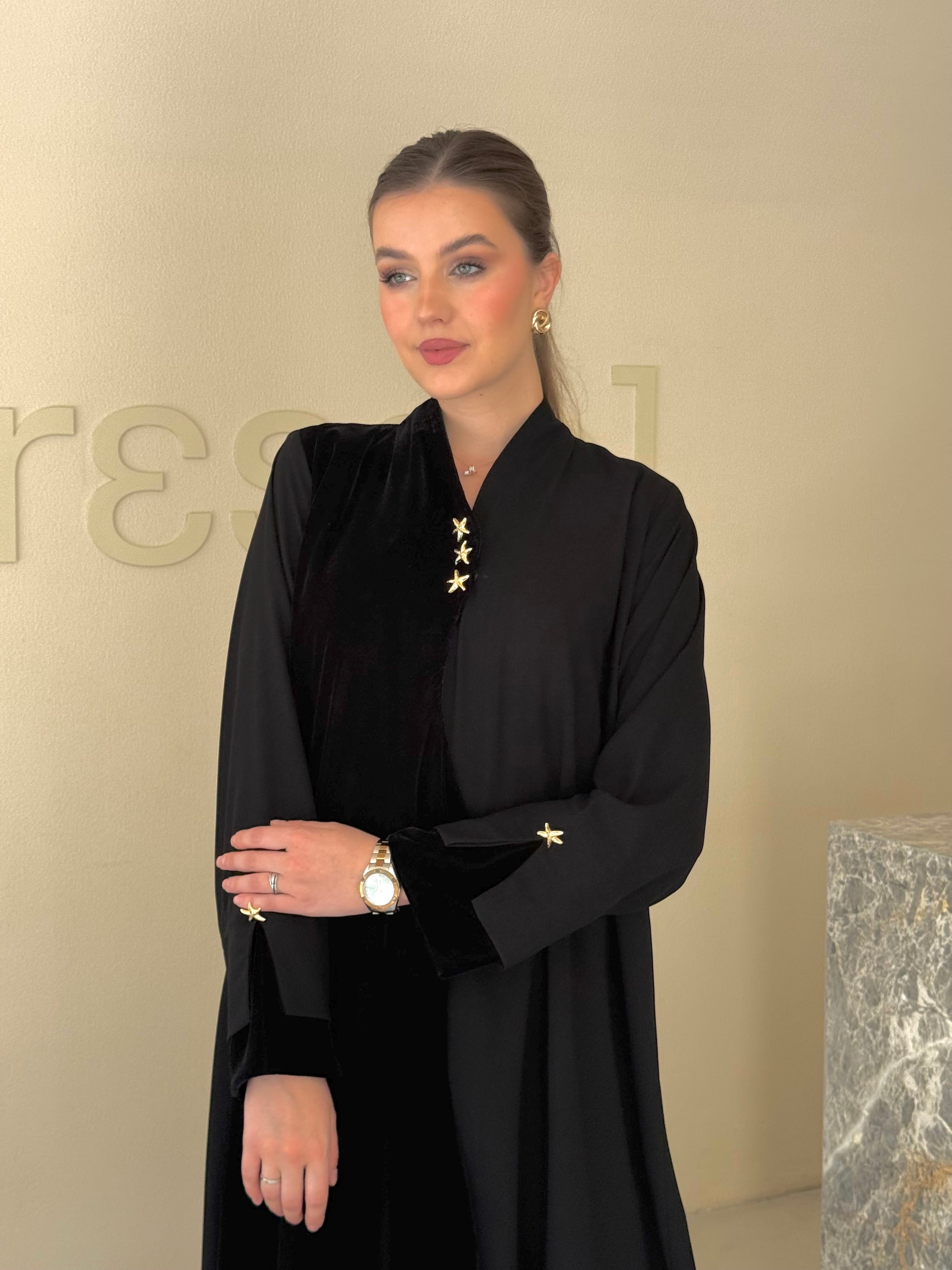 An elegant abaya featuring a refined mix of round shaped velvet and crepe fabrics, adorned with star-shaped buttons on front and sleeves