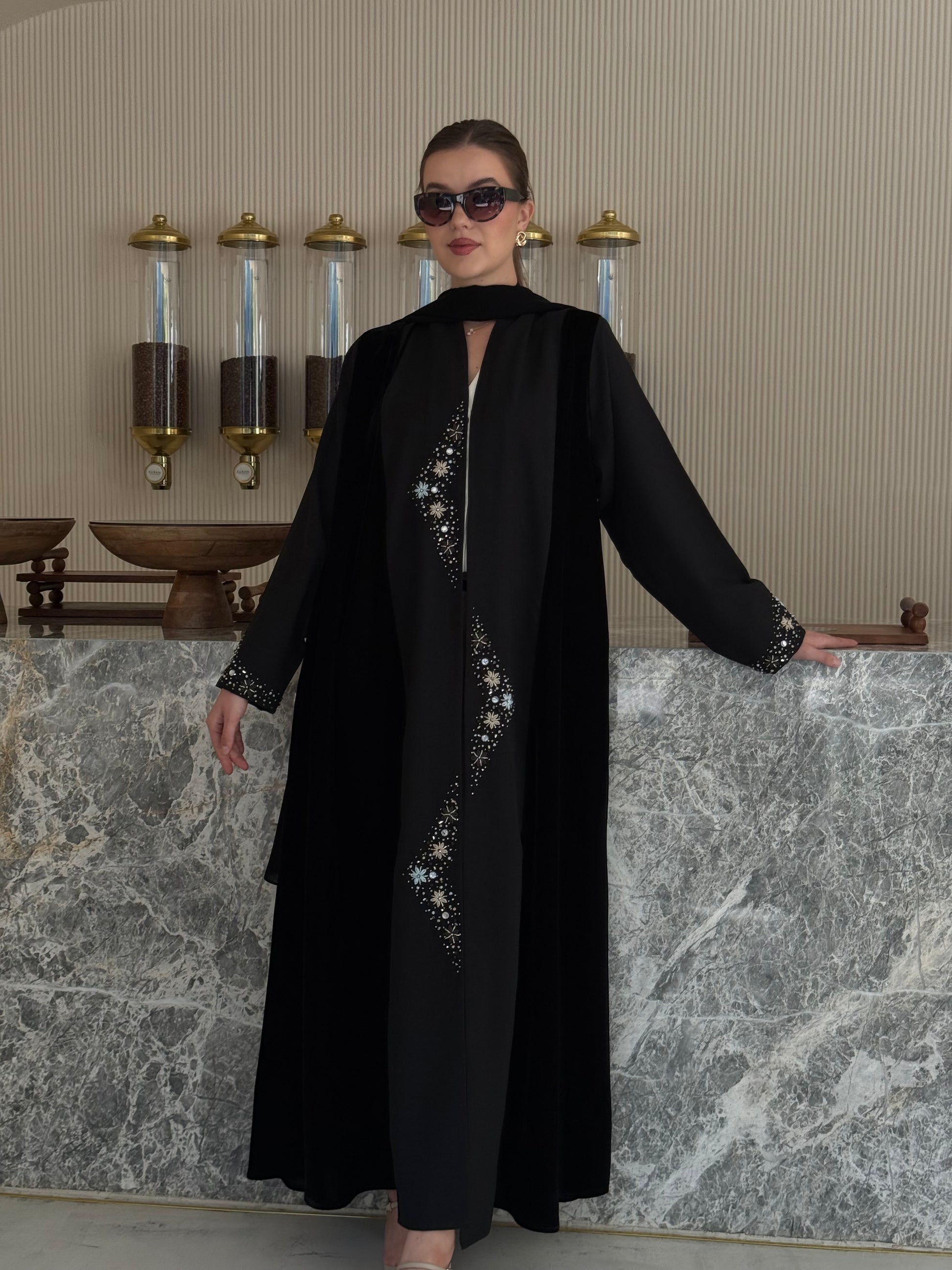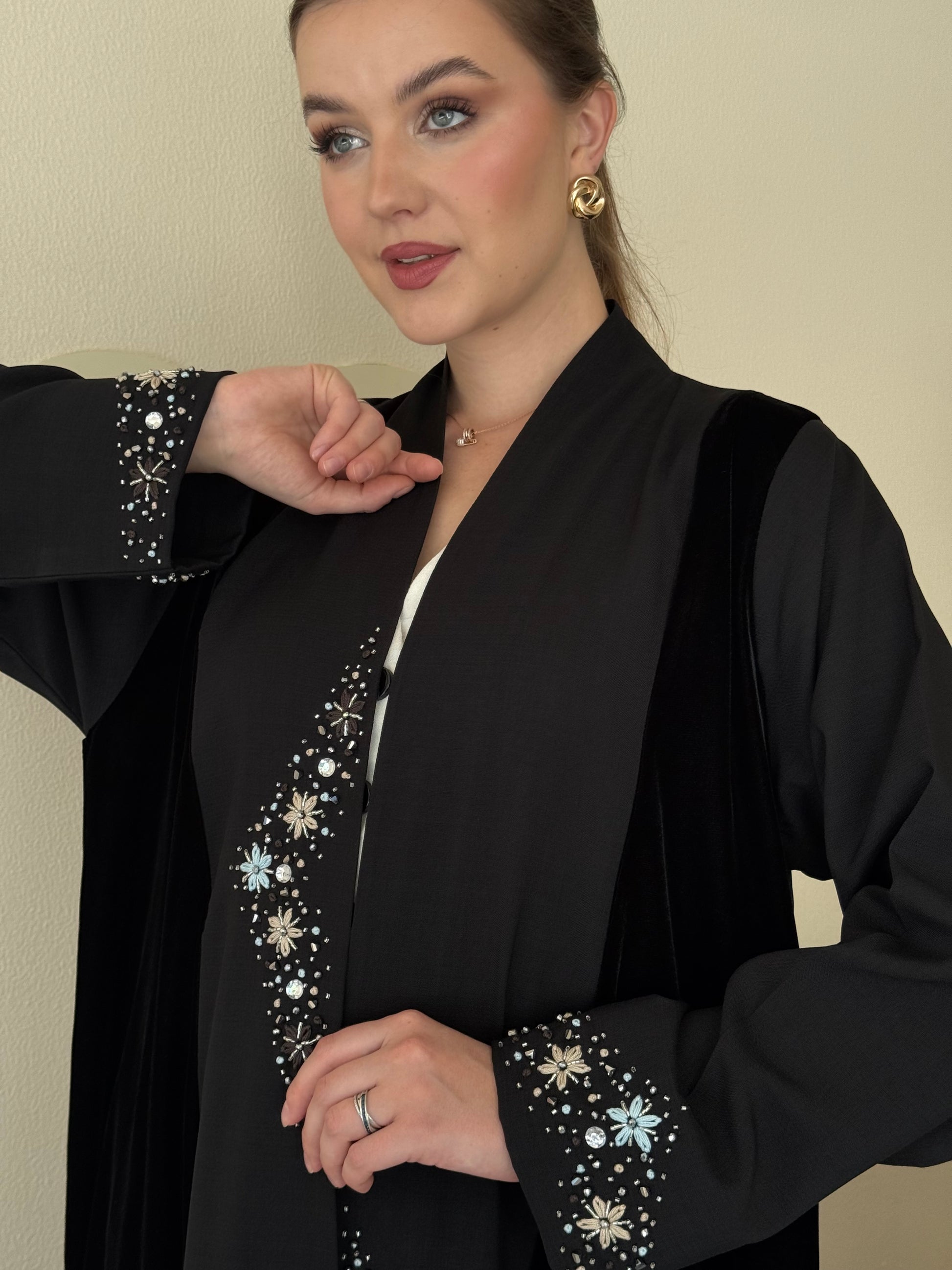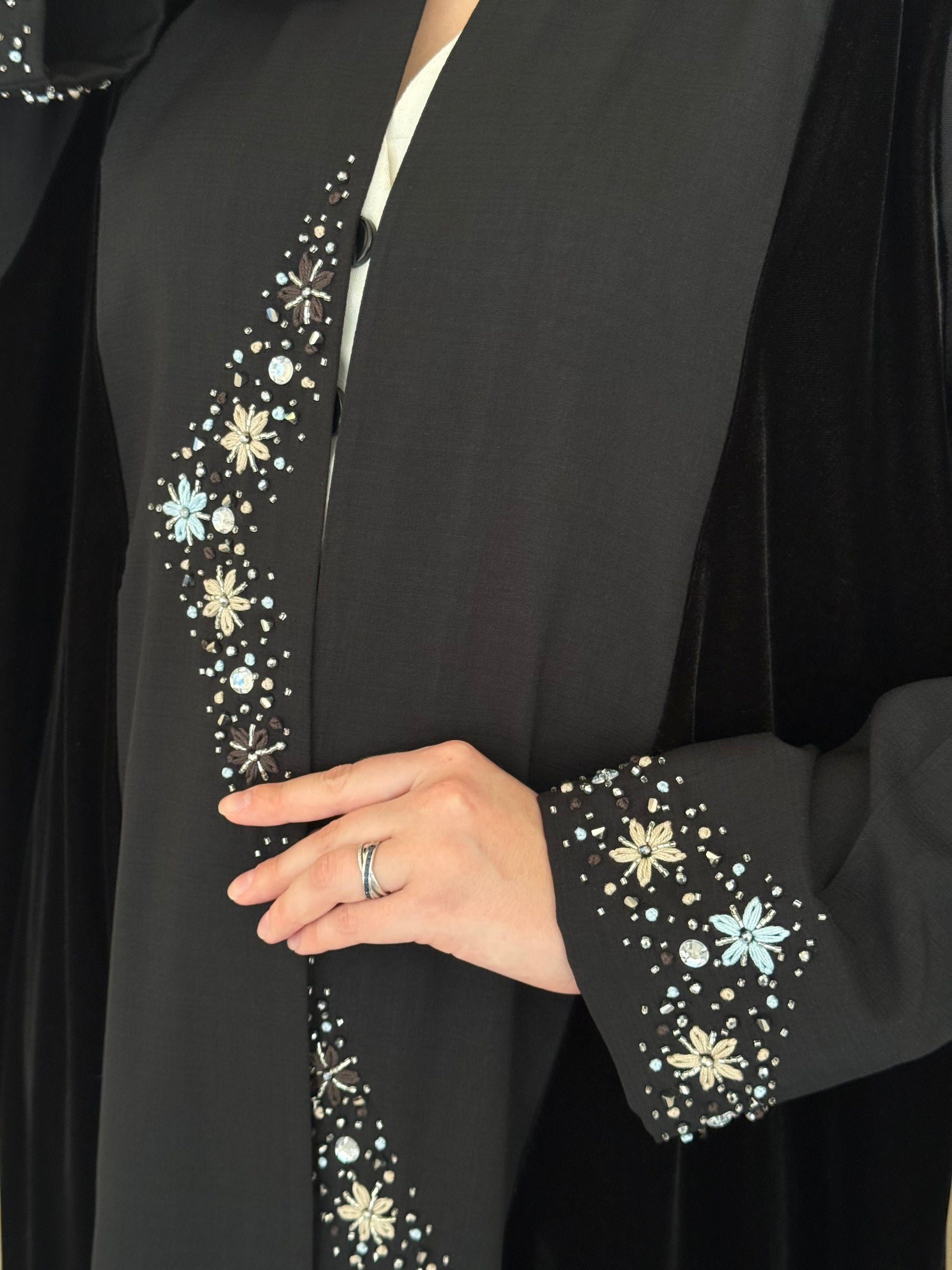 An elegant abaya featuring hand embroidery and delicate beadwork on the front and sleeves