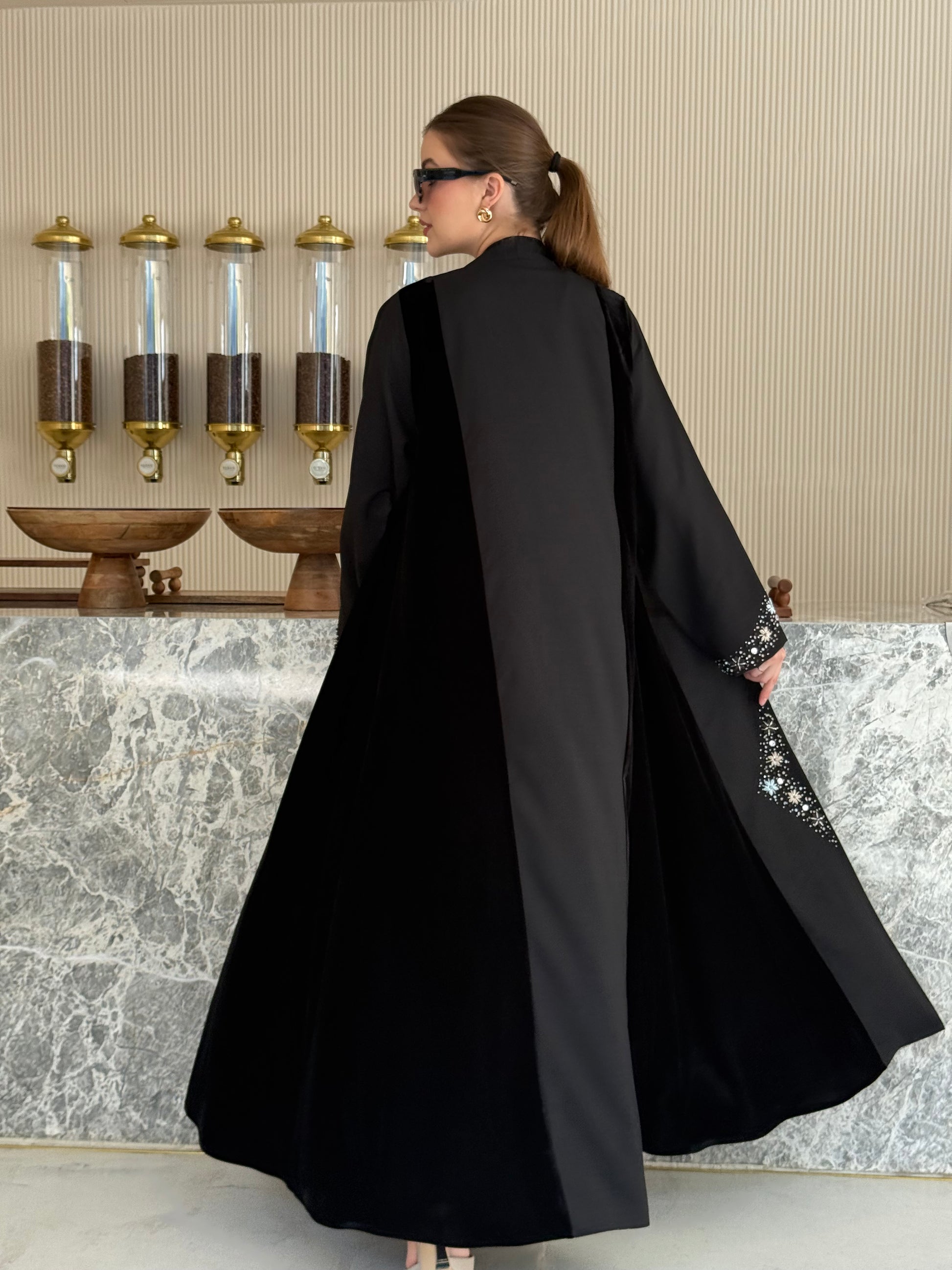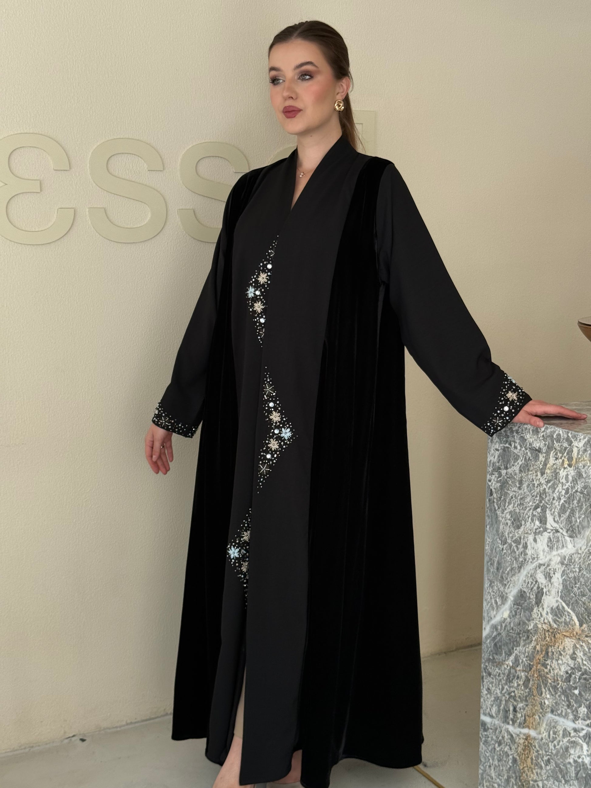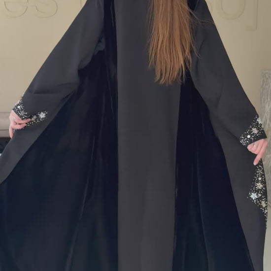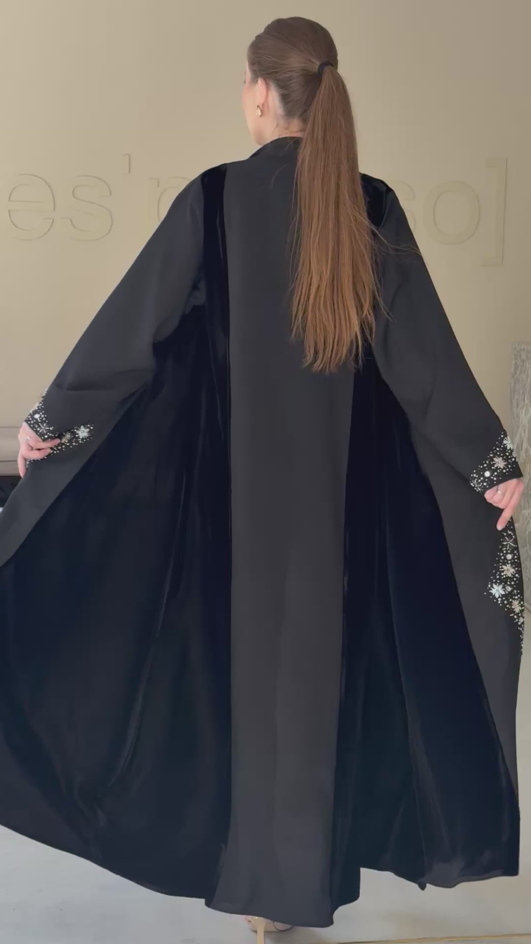 An elegant abaya featuring hand embroidery and delicate beadwork on the front and sleeves